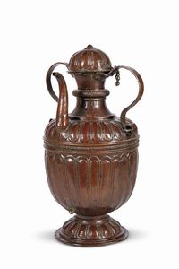 VERSATOIO DA ACQUARECCIA, TOSCANA, INIZI SECOLO XVII in rame sbalzato, corpo ovoidale ornato da motivo di doppia [..]