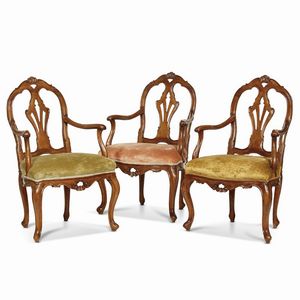 TRE POLTRONE, VENETO, SECOLO XVIII in legno intagliato, rivestite in stoffa gialla, verde e rossa, con schienale [..]