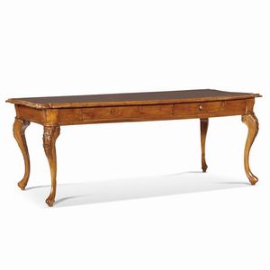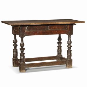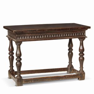 TAVOLO, ITALIA CENTRALE, SECOLO XVI in noce di forma rettangolare, il piano aggettante sottende fascia fittamente [..]