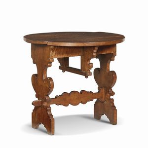 TAVOLINO DA LAVORO, TOSCANA, SECOLO XVII in noce, piano di forma circolare con bandelle, sostegni intagliati ad [..]