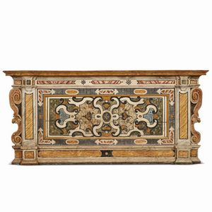 CREDENZA, TOSCANA, PRIMA METÀ SECOLO XVIII in legno di noce con piano sagomato e profili dorati, fronte [..]