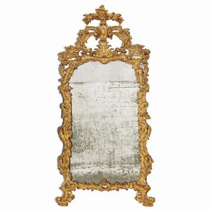SPECCHIERA, GENOVA, PRIMA METÀ SECOLO XVIII in legno intagliato e dorato, cimasa lavorata a giorno con [..]