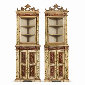 COPPIA DI ANGOLIERE, TOSCANA, SECONDA METÀ SECOLO XVIII in legno dipinto e laccato in policromia, struttura [..]