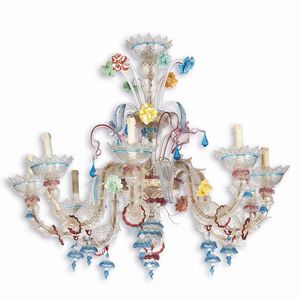 LAMPADARIO, MURANO, INIZI SECOLO XX in vetro incolore e policromo, il palco superiore decorato con grandi fiori [..]
