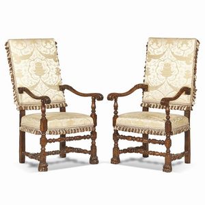 COPPIA DI POLTRONE, LOMBARDIA, FINE SECOLO XVII in noce, braccioli mossi terminanti a ricciolo decorati da intagli [..]