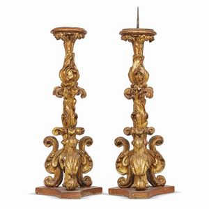 COPPIA DI TORCERE, ITALIA CENTRALE, SECOLO XVIII in legno intagliato e dorato, con fusto e base tripode arricchita [..]