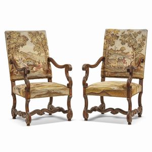 COPPIA DI POLTRONE, LOMBARDIA, INIZI SECOLO XVIII in noce, braccioli e gambe di linea mossa scanalate e terminanti [..]