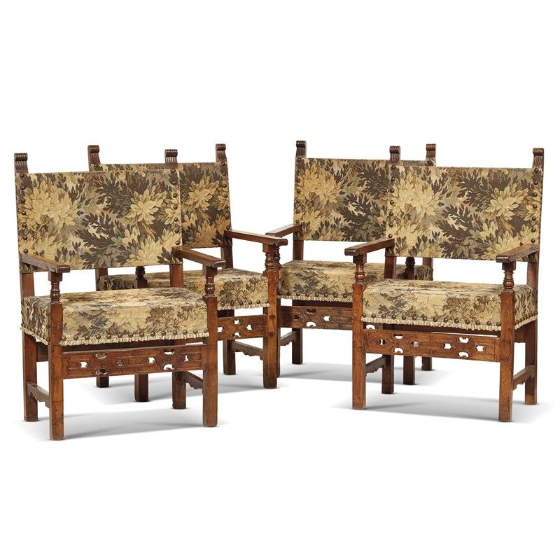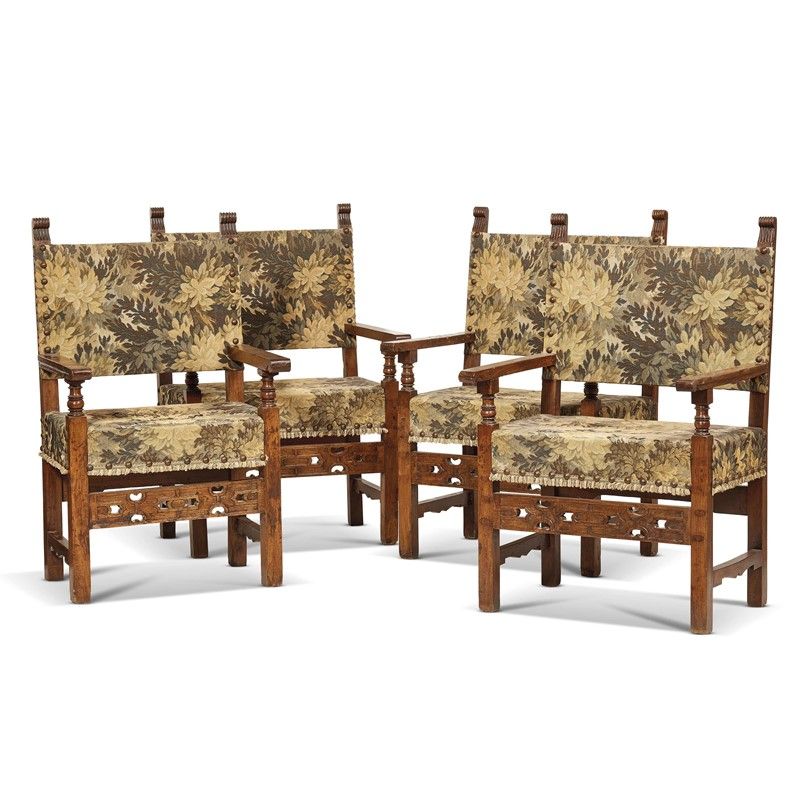 OTTO SEGGIOLONI, ITALIA SETTENTRIONALE, SECOLO XVII in noce intagliato, braccioli diritti su sostegni a balaustro, gambe anteriori di linea dritta riunite da traversa traforata, seduta e schienale rivestiti da tessuto in arazzo decorato a folto fogliame fissato da borchie, cm 115x66x56