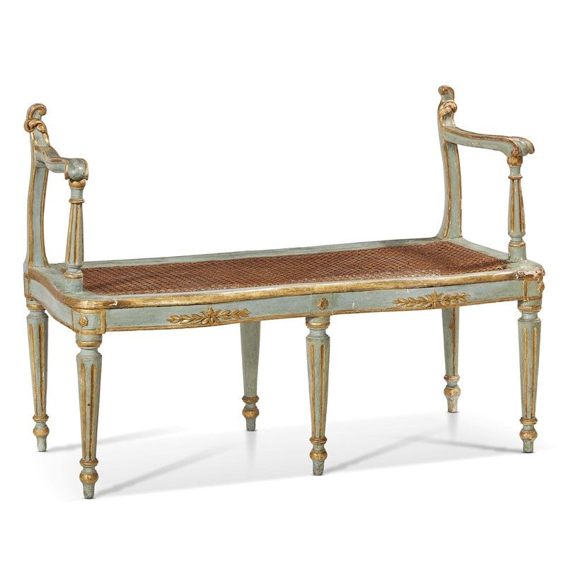PANCHETTA, ITALIA CENTRALE, SECONDA METÀ SECOLO XVIII in legno intagliato e laccato d’azzurro, seduta in paglia di Vienna, braccioli di linea mossa, fascia con profilature e motivi vegetali dorati, sei gambe coniche scanalate, cm 87x118x52