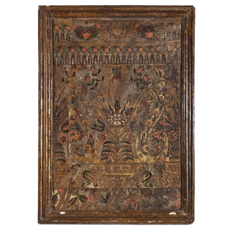 in cuoio dipinto e argentato a mecca costituito da più frammenti cuciti insieme raffiguranti volute, decori vegetali e motivi stilizzati insieme ad una testa di cherubino, cm 88x60 (completo di cornice cm 99x71)