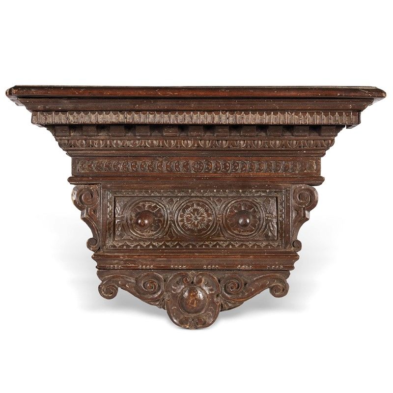 in legno di noce intagliato, piano aggettante scende in più modanature, fascia sottopiano a motivo di unghiature e altra fascia lavorata a bacellatura, cartella parietale decorata con tre rosoni, due dei quali ospitano pomelli torniti, cm 63,5x43x16