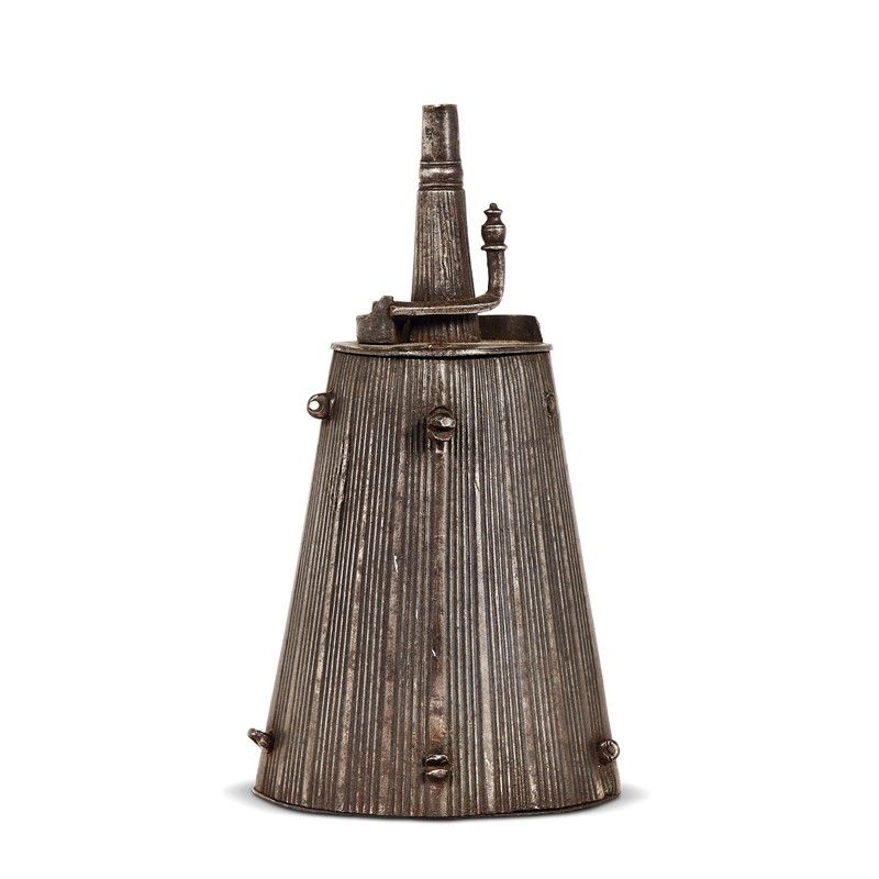 in ferro, corpo trapezoidale percorso da sottili scanalature sormontato dal versatore, cm 21x11x7
