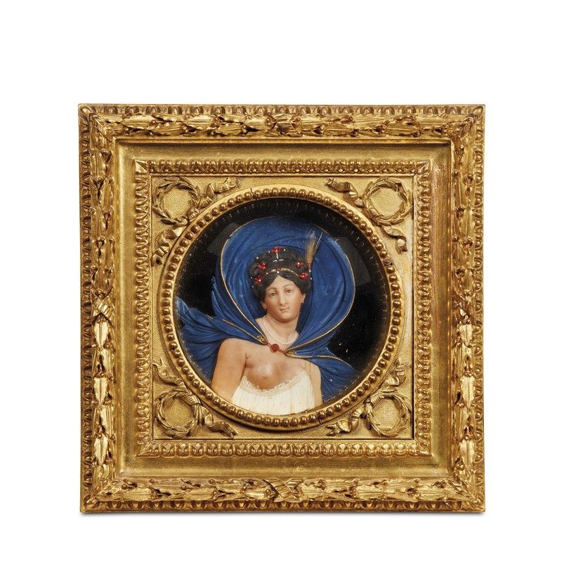 RITRATTO DI FANCIULLA, ATTRIBUITO A CLEMENTE SUSINI (1755-1814) in cera policroma su ardesia, raffigurante un ritratto di fanciulla semi vestita con elegante acconciatura che indossa un grande mantello blu legato al collo, entro cornice in legno intagliato e dorato, cm 22x22 (complessivamente)