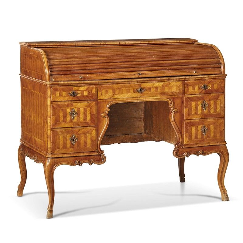 SCRIVANIA A RULLO, ITALIA SETTENTRIONALE, SECONDA METÀ SECOLO XVIII lastronato in legni vari, di linea sagomata, fronte a sette cassetti con intarsi in legni chiari e scuri alternati a formare motivo geometrico che orna anche i fianchi, il profilo della fascia inferiore è marcato da intagli aggettanti a voluta che proseguono su gambe di linea mossa, cm 102x120x70