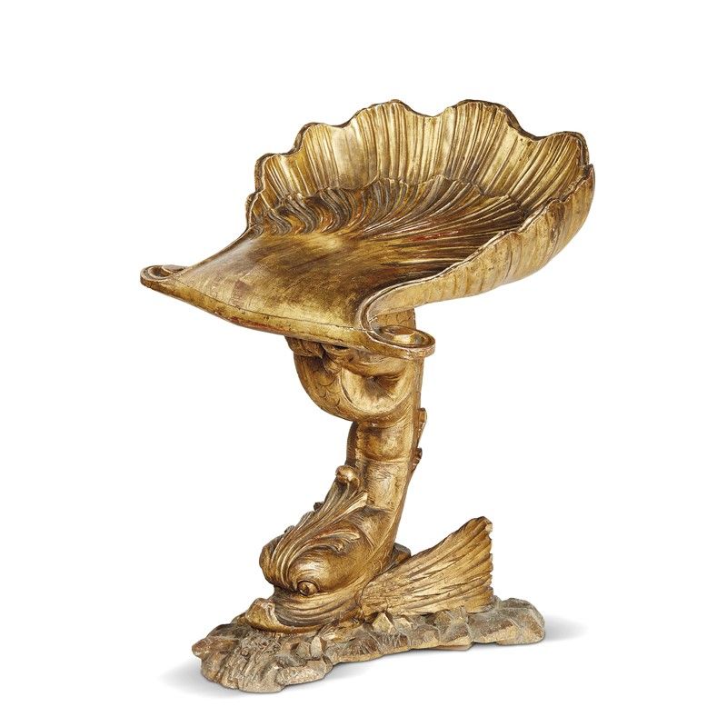 in legno intagliato e dorato, seduta sagomata a forma di ampia conchiglia sorretta da mostro marino su base ad imitare le rocce, cm 63x48x48