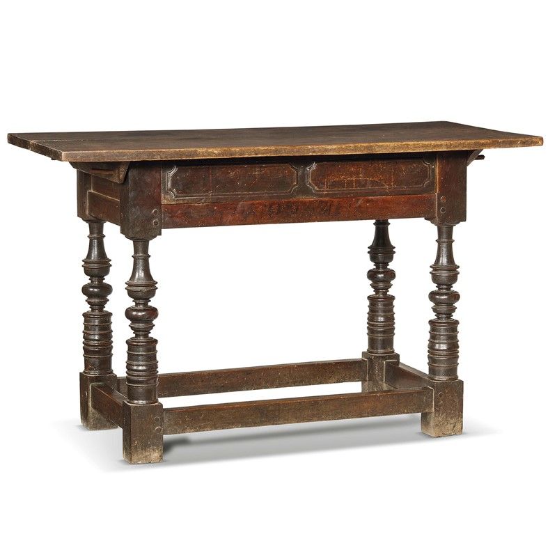 in noce, piano aggettante di forma rettangolare poggia su fascia con ampio cassetto centrale sformellato, sorretto da gambe tornite a balaustro e piedi a dado riuniti da traverse lineari, cm 87,5x139,5x68