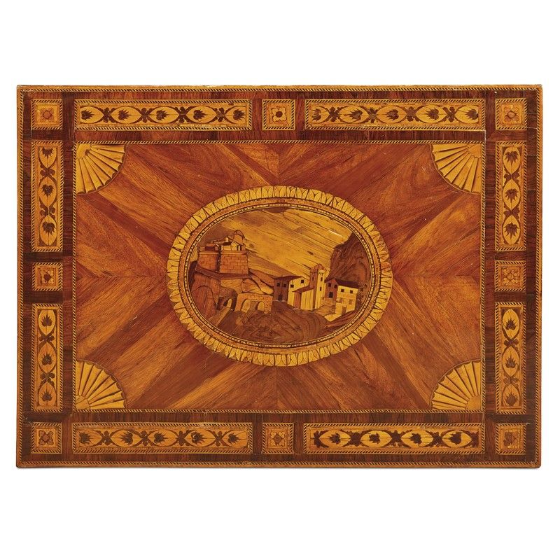 lastronato in legni vari, sul piano a scorrimento è raffigurato un paesaggio entro medaglione ovale e quattro decori a ventaglio a ornare gli angoli, il tutto incorniciato da profilo esterno a grottesche e fiorellini. La fascia è interamente decorata da riquadri geometrici, all'interno dei quali si intervallano scene di paesaggio, grottesche di gusto cinquecentesco e ghirlande fogliacee, fronte a ribalta a celare interno composto da vari cassetti segreti e un piano a tablette scorrevole, sorretto da gambe troncoconiche, cm 79x98x72
