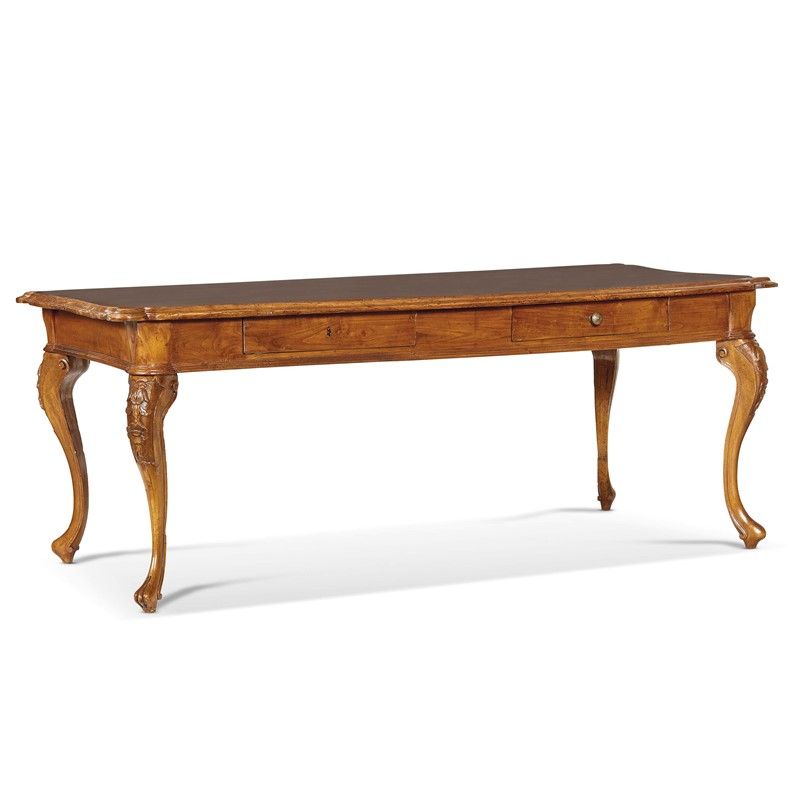 TAVOLO DA PRANZO, VENEZIA, SECOLO XVIII in legno, piano aggettante con bordura di linea mossa, sottofascia sottesa da due cassetti, sorretto da gambe sinuose ornate da decori floreali sulla parte superiore che terminano in piedi a ricciolo, cm 84x203x92