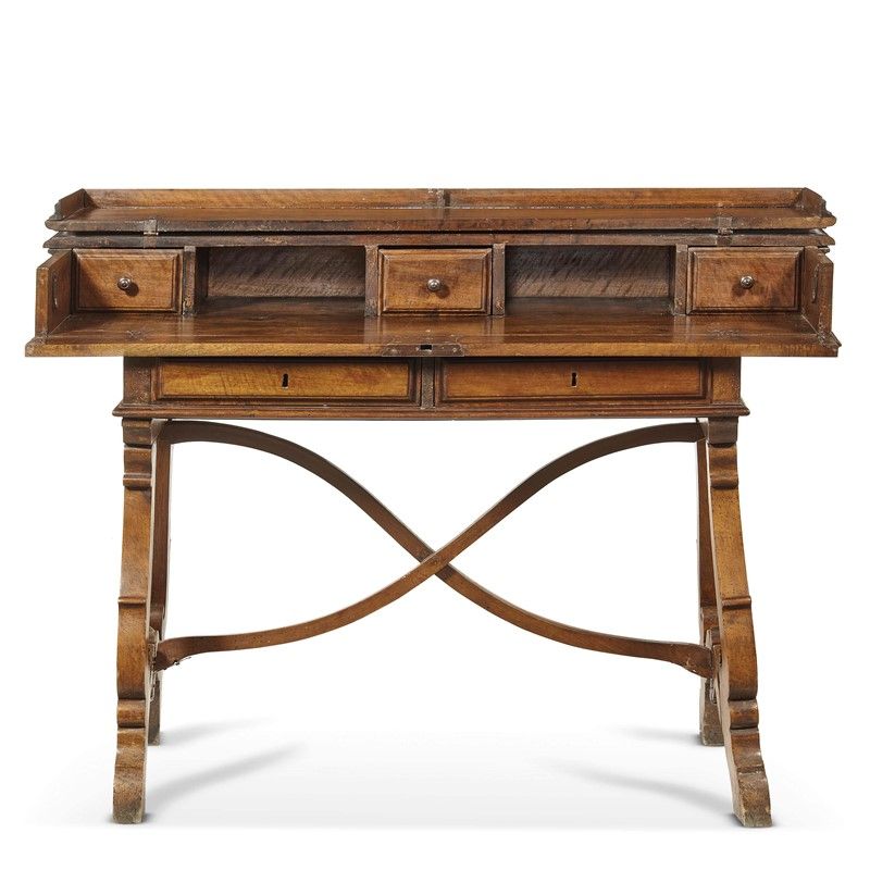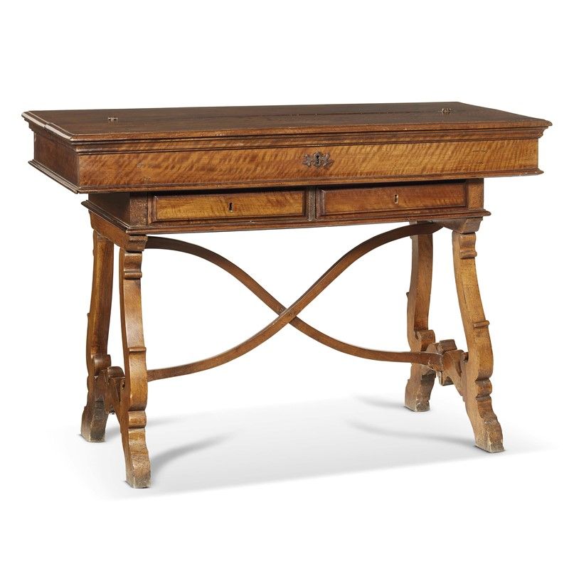 TAVOLO SAN FILIPPO, TOSCANA, INIZI SECOLO XVIII in noce, piano leggermente aggettante apribile e fascia a ribalta celante tre cassetti alternati a due vani; sotteso da sottofascia a due cassetti e poggiante su gambe a lira riunite da traverse sagomate, cm 99x141x66,5