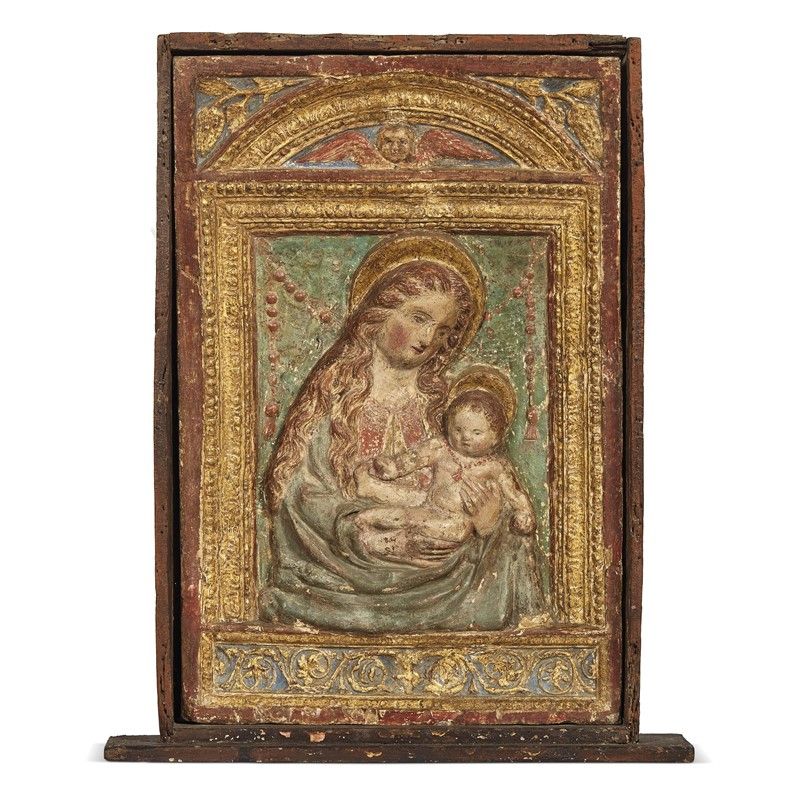 Northern Italy (Lombardy?), late 15th century, Madonna with child, polychromed and gilt putty, 66x53x8,5 cm