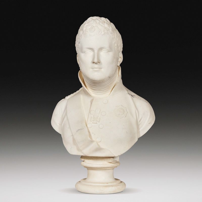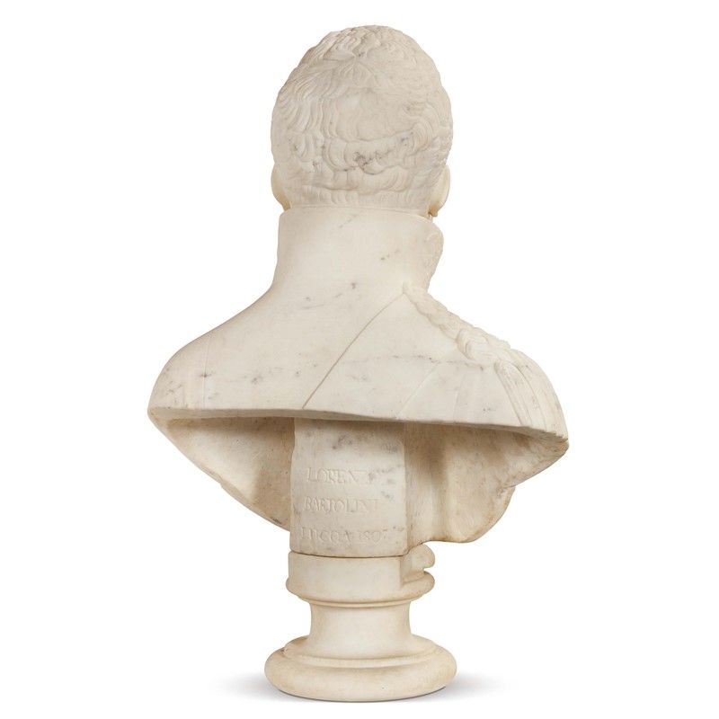 La scultura in asta, firmata e datata “Lucca 1807”, rappresenta lo zar in abiti moderni e fa parte delle opere eseguite da Bartolini per il Banco Elisiano di Carrara, un’officina fondata dalla sorella di Napoleone, Elisa Baciocchi, con lo scopo di diffondere i busti ufficiali dei sovrani in tutta Europa. Oltre alla scelta di rappresentare il sovrano in abiti moderni e dunque di una certa mancanza di idealizzazione, è interessante soffermarsi sulla datazione, che rimanda al primo periodo di governo dello zar, discusso tanto per il rapporto con il padre Paolo I quanto per l’ambiguità espressa nei confronti di Napoleone stesso, che poi sconfisse nella tragica campagna di Russia. In virtù del grande amore per le arti, Alessandro I
