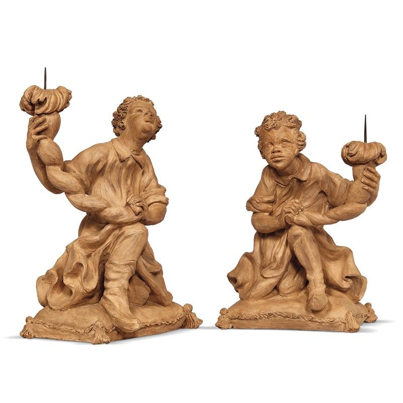 Venice, 18th century, A pair of moors holding chandeliers, terracotta, 46x34x26 cm and 43x35x24 cm