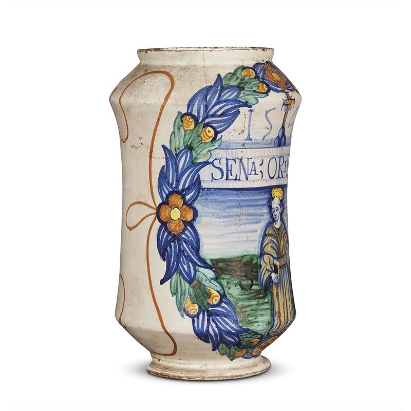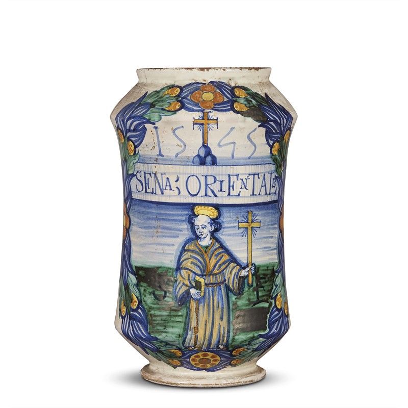 L’albarello ha forma cilindrica appena rastremata al centro, spalla e calice angolato e poggia su un piede a disco a base piana, il collo è breve e l’orlo tagliato a stecca. Il fronte mostra una ghirlanda floreale decorata al suo interno nella parte mediana da un cartiglio semplice, ombreggiato di blu, reca la scritta in caratteri capitali SENA.ORIENTALE, sormontato da un trimonzio che sostiene la croce accompagnato dalla data 1545, mentre la parte inferiore mostra la figura di San Francesco rivolta a destra che sorregge la croce e il libro della regola o il Vangelo. Il santo, accompagnato dalle iniziali S e F, è dipinto con attenzione e inserito in un paesaggio collinare con cielo sfumato. L’albarello, così come altri esemplari di confronto, datati al 1623 o comunque tra il XVI e il XVII secolo, doveva appartenere ad una farmacia conventuale francescana. Alcuni frammenti con il simbolo del Trimonzio sono stati reperiti in ambito umbro e tutti gli esemplari di confronto portano l’attribuzione in ambito derutese, con datazioni diverse in base agli ordinativi di reintegro. Si vedano ad esempio l’albarello in collezione Bayer di Milano o quello al Museo di Deruta già in collezione Pecchioli. Il nostro esemplare però, probabilmente appartenete ad un corredo differente, si distingue per la maggior raffinatezza nella realizzazione.