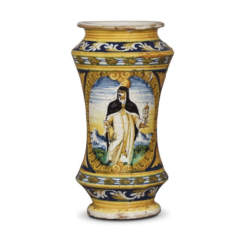 L’albarello ha bocca larga appena estroflessa, collo breve e rastremato così come il piede dallo spessore alto; il corpo ha forma troncoconica con spalla e calice dal profilo angolato. L’ornato mostra al centro del corpo un medaglione ovale con una cornice a C rovesciate e affrontate decorata da un bugnato ad archetti. All’interno, con grafia corriva ma sicura, è raffigurata la figura di Santa Chiara, riconoscibile dagli attributi: la santa di Assisi in abito monastico mostra l’ostensorio e il libro della Regola. Il retro dell’albarello è interessato da una decorazione a girali fogliate, disposte simmetricamente, colorate in giallo e giallo-arancio centrate da fiorellini multipetalo redatti in blu a risparmio sul fondo dipinto in blu cobalto molto carico, quasi ripassato a definire meglio il decoro. I decori minori, a foglia frastagliata, corrono lungo la spalla e il piede con ombreggiature di bistro scuro. L’ornato privo di cartiglio, caratteristico della produzione faentina, si diffuse anche in ambito siciliano, rendendo come in questo caso difficile l’attribuzione. Un confronto, alla cui lettura critica rimandiamo, ci viene da un piccolo albarello delle collezioni della Fondazione del Banco di Sicilia a Palermo, nel quale ravvisiamo un ductus pittorico simile.