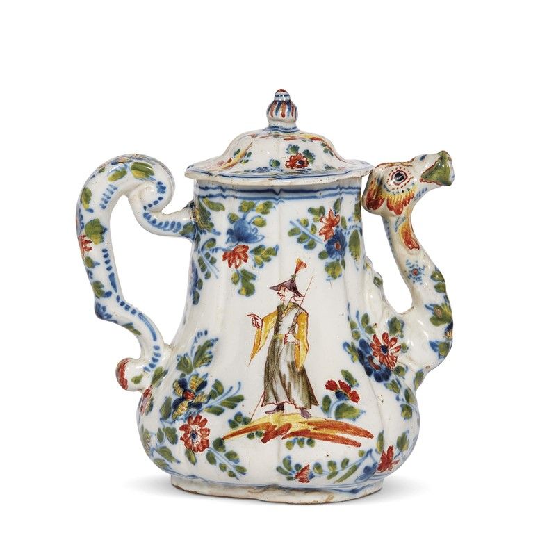 La caffettiera ha forma orientaleggiante alla turca, il corpo costolato si allarga verso il basso e poggia su un basso piede. L’opera si differenzia dalle altre della manifattura per la presenza del versatoio che parte secondo un gusto orientale dalla pancia per salire verso l’orlo, mentre il cannello si diparte da un elegante elemento decorativo a rilievo e sale sinuoso fino al becco a forma di testa di drago che trattiene in bocca un breve tubicino; anche l’ansa è sagomata e segue l’andamento sinuoso tipico della manifattura, ma con un’angolatura iniziale e una sezione più ampia e squadrata. Il coperchio segue la costolatura del corpo e si alza per terminare in una presa a bottone. Il decoro “a paesaggini” è qui proposto in una versione arricchita: su un lato la figura di un cinese con alto copricapo e un piccolo bastone in una mano, sull’altro un’architettura “a castelletto” nei toni del giallo arancio, il tutto accompagnato da steli fioriti e fogliati. Sul coperchio si ripetono in miniatura la figura del cinese e il castelletto.