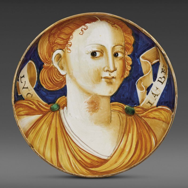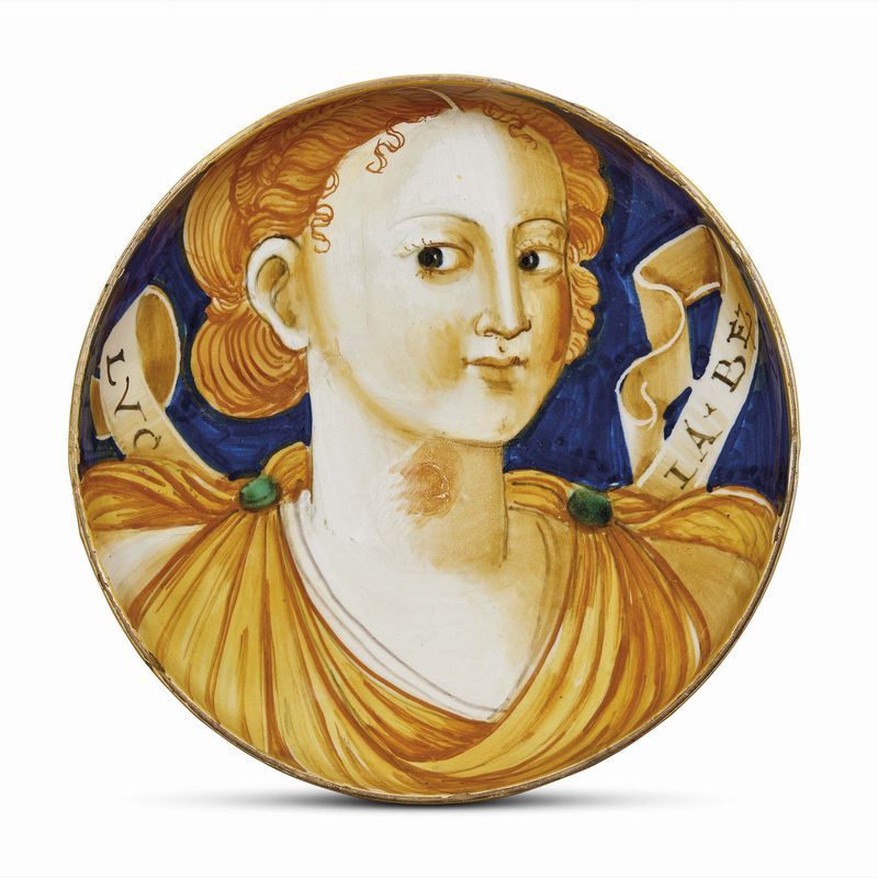 Questa coppa, che appartiene alla tipologia delle “belle”, utilizzate per celebrare le future spose da parte del promesso oppure come dono di fidanzamento, trova numerosi confronti in collezioni private e pubbliche, fra i quali indichiamo quella con figura femminile del Victoria and Albert Museum (Inv. n. 8930-1863), il bel ritratto di “Girolama” in una coppa conservata al Museo del Louvre (Inv. n. OA 1598), anche se forse più leggero nel tratto, soprattutto nel modo di trattare la capigliatura, rispetto alla coppa in esame, e anche la coppa con ritratto di “Bartolomea” del Metropolitan Museum of Art di New York (Inv. n. 1975.1.1103), databile attorno agli anni 1525-1530, che condivide con il nostro esemplare la resa dello sguardo e alcune particolarità tecniche. Particolarmente vicino per il modo di trattare l’incarnato con tecnica di velature di bianco su bianco, bistro e tocchi di arancio, per la resa degli occhi con l’interno sottolineato da una zona rosata e le ombreggiature sottilissime in bianco, ma anche per i capelli raccolti sulla nuca e altro ancora, è il frammento di coppa conservato al Bargello a Firenze e datato 1546 (3). E non lontano dal nostro ritratto è anche quello di “Dianora bella” del Museo di Lione, simile per la medesima impostazione del ritratto che interessa l’intera coppa, per la sapiente capacità tecnica nella resa dell’incarnato, per il modo di sottolineare il naso solo nella parte terminale lasciando al gioco cromatico il compito di delinearne la forma e infine per il medesimo modo di far cadere alcuni ciuffi arricciati delineati con un sol tocco di pennello.