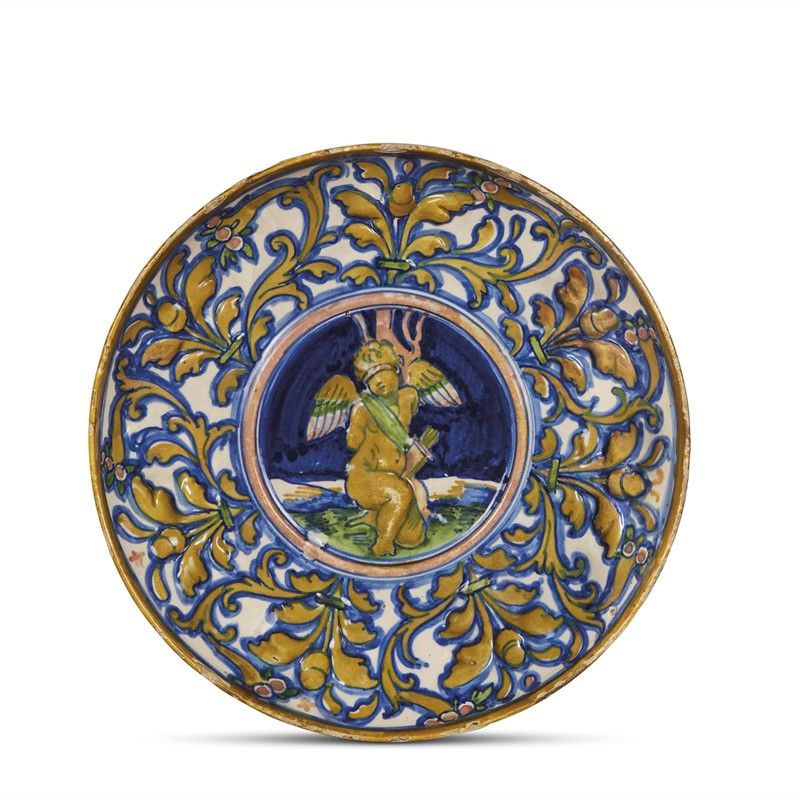 La coppa “abborchiata” in maiolica su basso piede ha il corpo realizzato a stampo e presenta, lungo la tesa, un decoro a rilievo con una sequenza continua di Inflorescenze e steli ricurvi dipinti con lustro dorato e sottolineato con ombre a larghe pennellate blu cobalto. Al centro dell’umbone, incorniciato da una sottile fascia rilevata lustrata in oro e rosso, è dipinto un tipico motivo amatorio con un amorino bendato e legato a un albero. Sul retro linee a raggera in lustro rosso e oro.