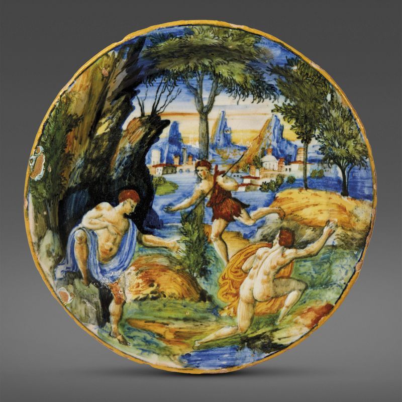 La coppa poggia su un piede ad anello molto basso, ha cavetto largo, tesa alta e stretto bordo estroflesso. La decorazione istoriata interessa l’intera superficie del cavetto. La scena raffigurata mostra un personaggio seduto sotto una roccia con il corpo coperto solo da un drappo azzurro, appoggiato su una spalla e su una gamba, mentre indica in basso verso uno specchio di acqua. Sulla tesa opposta un personaggio ignudo, con il corpo parzialmente coperto da un drappo giallo, sembra alzarsi dallo specchio d’acqua e indicare con una mano il cielo. Al centro della composizione un terzo personaggio, in abito da cacciatore, corre brandendo la lancia. Sullo sfondo, al di là della roccia e degli alberi che fanno da sfondo alla scena, si legge un paesaggio con città che si specchiano in un lago circondate da montagne alte con il profilo squadrato. Sul verso del piatto non compare alcuna scritta didascalica, ma la scena può essere interpretata come la morte di Narciso, raffigurato prima al centro della scena quando, secondo la versione classica, è un giovane talmente bello e ammirato che tutti se ne innamorano, ma egli non se ne cura e passa il suo tempo cacciando in solitudine, e poi, dopo aver rifiutato la ninfa Eco, si trasforma e passa il suo tempo ad ammirare la propria immagine, quindi muore struggendosi d’amore, il suo corpo trasformato nel giallo e splendido fiore di primavera che porta il suo nome. La decorazione sembra quindi descrivere tre momenti del Mito, incentrata esclusivamente sull’immagine di Narciso. Lo stesso mito è stato variamente raffigurato in maiolica, e non è trascurabile il cambio di lettura derivato dall’interpretazione che nel Medioevo muta il giudizio positivo della figura di eroe tragico della classicità alla versione in negativo negativa di colui che ammira l’effimero. Le caratteristiche stilistiche e la sintassi decorativa ci portano a orientare la nostra ricerca tra le botteghe di Urbino o del Ducato nella prima metà del Cinquecento, pensando alla mano di Francesco Durantino per quest’opera che presenta molte problematiche di cottura. La rapidità della stesura e alcuni particolari ci suggeriscono infatti la paternità di Francesco, come ad esempio il personaggio disegnato di schiena, che compare spesso nelle sue opere, oppure la dinamicità nell’impostare le figure dei personaggi. Un piatto attribuito al pittore durantino con Glauco e Scilla del Victoria and Albert Museum datato 1545 (inv. n. 1777-1855, n. 861) costituisce un valido confronto: nelle figure dei personaggi, nell’uso del rosso nelle capigliature del personaggio, nella scena che riproduce tre differenti momenti della narrazione e in alcuni dettagli del paesaggio. Ed anche la presenza di piante con fogliame realizzato in vario modo con spruzzature di giallo e di ciuffi d’erba a piantine separate, nella nostra coppa accennate con tratto blu, si riscontra in altre opere di quest’autore, come ad esempio sempre dal Victoria and Albert nel piatto con Psiche, anch’esso databile al 1545 circa, con un cespuglio al centro della composizione, (inv. C2257-1910, n. 856). Inoltre in un piatto firmato e datato 1543 dell’Austrian Museum of Applied Arts / Contemporary Art (KE 6699) con la raffigurazione della Guerra tra i Titani firmato e datato 1543, ritroviamo molti elementi del nostro piatto, ad esempio nei corpi nudi dipinti di schiena, uno sulla tesa a destra raffigurato seduto, un altro in piedi in fondo al cavetto che porta un blocco di pietra, ma anche nei volti con le guance leggermente lumeggiate di rosso, o nel modo di delineare le pieghe delle vesti con tocchi di stagno. Altri indizi che ci riportano all’opera del Durantino sono la posizione un poco rannicchiata con una gamba appoggiata in alto, che si ritrova ad esempio nella figura femminile del piatto con la nascita di Adone (J. Lessmann, Herzog Anton Ulrich-Museum Braunschweig. Italienische Majolika, Katalog der Sammlung, Brunswick 1979, p. 185 n. 163), e ancora le rocce e gli alberi del piatto con Giunone che scopre Io e Giove (op. cit., p. 188 n. 170), o le montagne e la dinamicità della figurina al centro del piatto con Cadmo che uccide il Drago (op. cit., p. 188 n. 169).