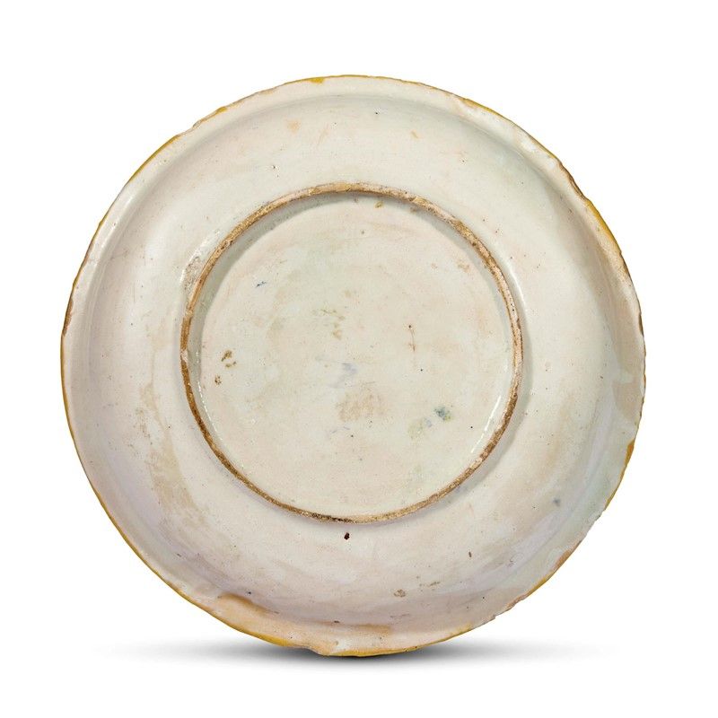 in maiolica dipinta in policromia con verde, giallo antimonio, blu di cobalto, bruno di manganese nei toni del nero, nero-marrone, rosso ferraccia, tocchi di bianco di stagno; alt. cm 4, diam. cm 23,3, diam. piede cm 13