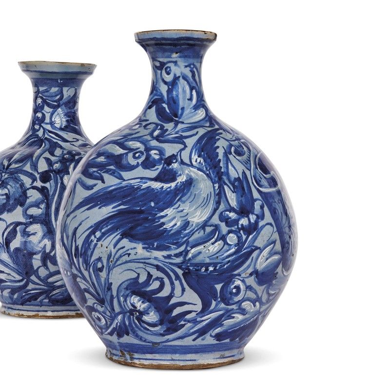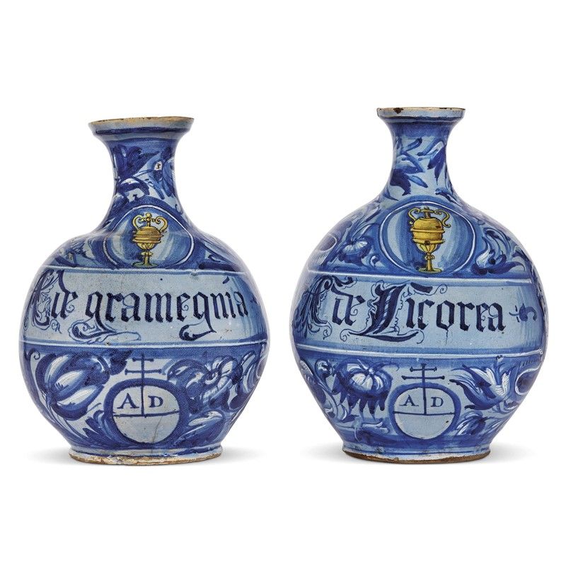 La ripetitività della decorazione a fogliame in monocromia turchina come ornamento per vasi apotecari è da tempo motivo di riflessione da parte degli studiosi a proposito di una definizione certa della provenienza di questa tipologia apotecaria. Il repertorio decorativo che si sviluppa sul retro, accompagnato in uno dei contenitori da una figura di uccello ad ali spiegate, delineato in blu su fondo berettino, unitamente alla morfologia dei vasi ci pare attinente per forma e decoro ad una produzione di ambito veneto. E grazie soprattutto al confronto con i grandi piatti a fondo berettino con decoro fogliato, come ad esempio quello del Museo di Norimberga, troviamo conferma circa l‘uso di altri colori, soprattutto in associazione agli emblemi. I due vasi, che propongono il motivo a foglia bipartita con grande potenza espressiva con sottolineature e ombreggiature in bianco di stagno, si avvicinano molto alle esecuzioni posteriori agli anni quaranta del secolo XVI, lasciando aperta l’assegnazione delle opere a una delle principali botteghe venete allora presenti nella città lagunare e ancora influenzate da certi stilemi di area adriatica. Si vedano in particolare i decori sottili, quasi alla porcellana, presenti sui riccioli dei cartigli. Il confronto con opere apotecarie in ambito lagunare conferma l’attribuzione, ed i riscontri più prossimi ci derivano da un albarello con insegna policroma di monastero del Museo Praza di Praga e un orciolo con la medesima decorazione in una raccolta privata, entrambi con emblema con un angelo. Un ulteriore esempio di questa produzione viene da due albarelli anch’essi accompagnati dall’emblema dell’angelo e da uno stemma possibilmente dell’ordine domenicano, che era ben presente a Venezia nella chiesa di San Giovanni e Paolo. I due albarelli, esposti al Philadelphia Museo of Art, mostrano nel tessuto compositivo boccioli dai lunghi petali e foglie bipartite.