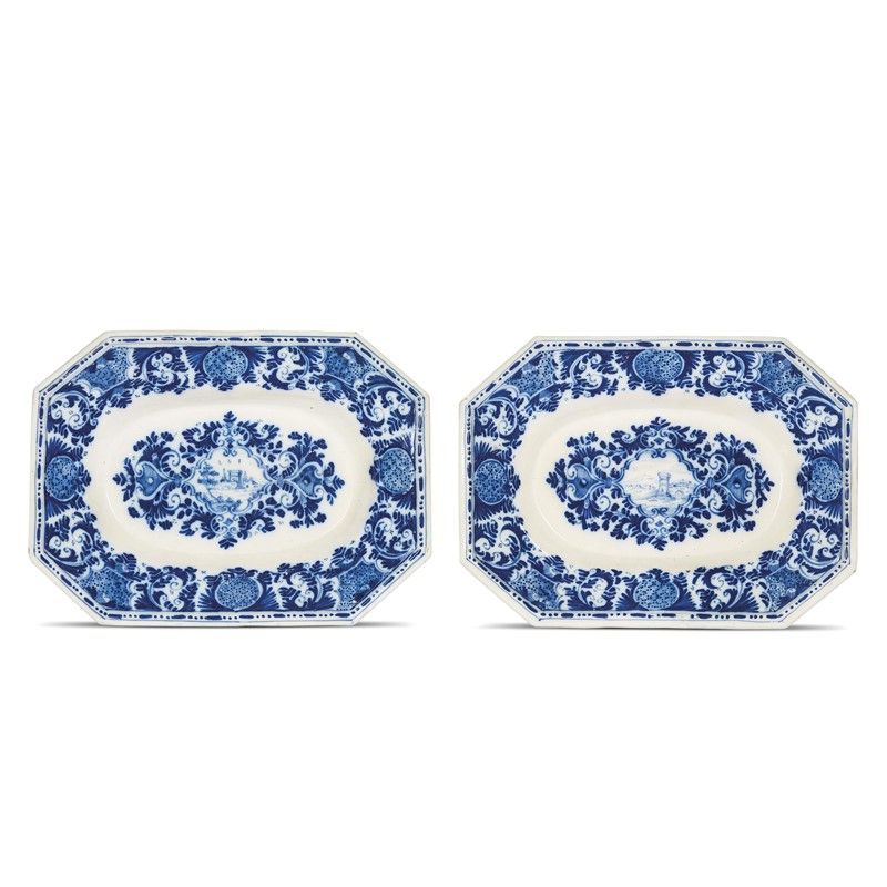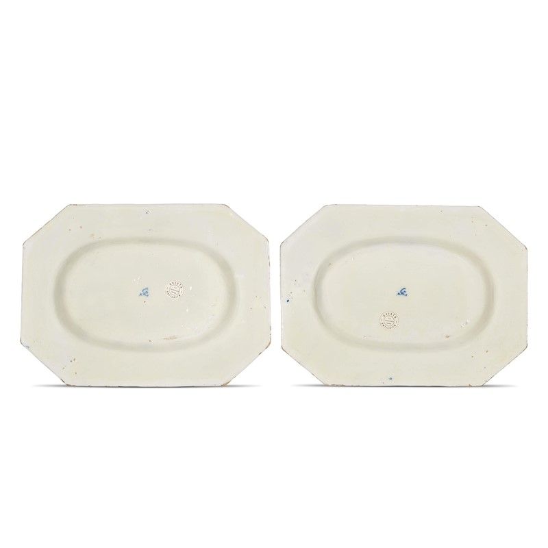 I due vassoi ovali hanno forma ottagonale con tesa orizzontale con bordo rilevato e base piana, sotto la quale in entrambi gli esemplari spicca la sigla GR. Il decoro monocromo a rayonnant interessa la tesa e incornicia al centro del piatto una riserva che contiene la raffigurazione di un paesaggio monocromo blu con riserva con paesaggi.