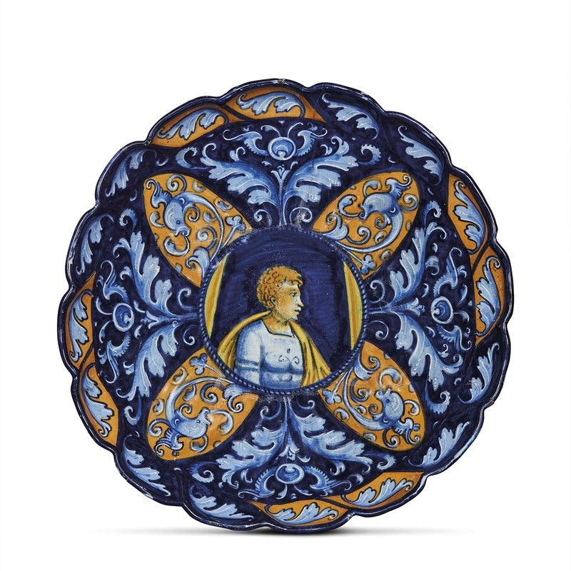La coppa presenta un umbone centrale rilevato, tesa baccellata a conchiglia con orlo sagomato, e poggia su alto piede. L’ornato mostra sulla tesa un motivo “a quartieri” ovaleggianti con motivo a grottesca in azzurro su base arancio, a formare nelle restanti aree riserve centrate da motivi a fitomorfi su fondo blu. Nell’umbone un ritratto maschile a tre quarti disposto di profilo: il giovane, dalla corta capigliatura, indossa una lorica e un mantello, e lo sfondo blu è interrotto da due quinte parallele di colore giallo; entro le riserve sono dipinti tralci fogliati, foglie stilizzate e delfini su fondo arancio, verde e blu. Sul retro un motivo a corolla nei colori blu e arancio a ornare le pareti della coppa.