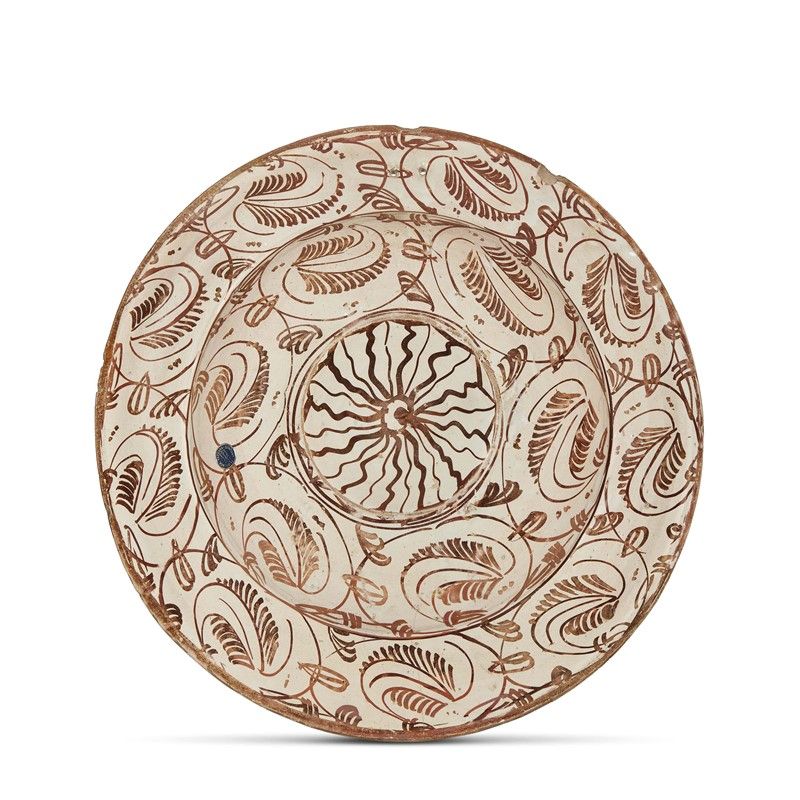 Il piatto da parata è caratterizzato da una tesa larga appena inclinata e cavetto profondo centrato da umbone rilevato. La tesa, come di consueto, mostra un foro eseguito prima della cottura, per facilitare l’esposizione del piatto a parete. La decorazione del fronte, che si estende sull’intera superficie, segue la morfologia del piatto, sviluppandosi su due larghe fasce concentriche intervallate da sottili bande redatte in lustro rosso, in blu oppure lasciate a risparmio. A dominare il decoro è una fitta teoria di motivi vegetali stilizzati con alberelli e cespugli tra steli sinuosi, mentre l’umbone è centrato da un fiore a sei petali. Anche il retro del piatto è interamente smaltato e dipinto secondo il tipico stile ispano-moresco, con foglie stilizzate sulla fascia esterna ed una serie di filetti concentrici intorno al piede, decorato con un rosone.
