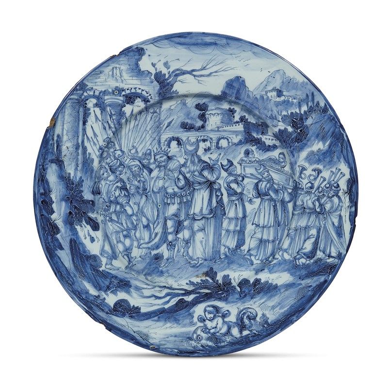 Il grande piatto, foggiato al tornio, ha larga tesa orizzontale con orlo arrotondato, balza morbida e ampio cavetto, apodo. Il decoro eseguito su smalto spesso interessa a tutto campo il fronte; lo smalto, appena azzurrato, perde di aderenza sul retro, rendendo appena visibile la marca. La scena raffigurata trae ispirazione dall’episodio biblico legato all’arca dell’alleanza: un re implora un guerriero mentre un sacerdote indica l’arca dell’alleanza, che si allontana preceduta dai sacerdoti con le trombe. Forse legato alla tematica della presa di Gerico, il piatto è dipinto con grande maestria: sullo sfondo un grande edificio turrito e porticato e, all’esergo, un piccolo putto cavalca un delfino. L’opera appartiene a pieno titolo alla grande stagione della produzione istoriata ligure, qui ancora vicina alle migliori espressioni delle sue botteghe. La marca con lo stemma di Savona fu impiegata nel corso del XVII secolo da più di una fabbrica del Borgo di San Giovanni a Savona, prima che si passasse all’utilizzo di altri simboli differenziati.