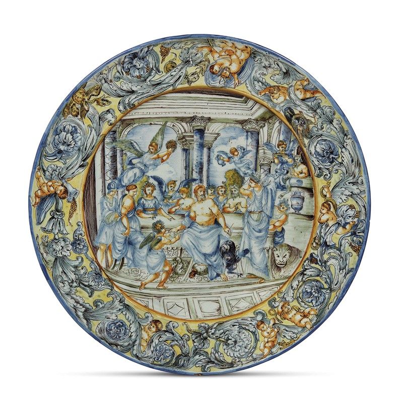 Il grande piatto, foggiato al tornio, ha larga tesa orizzontale con orlo arrotondato, balza sottile e ampio cavetto, e piatto poggia su piede ad anello poco rilevato. L’ornato della tesa vede una corona continua ad andamento sinuoso con fiori dalle corolle complesse con lunghi stami e petali sfrangiati, delineati in manganese su fondo giallo, sui quali si innesta un giuoco di putti e piccoli animaletti reali e di fantasia, centrati in alto da un satiro e una ninfa. Il decoro introduce alla scena principale che campeggia nel cavetto con la descrizione di un banchetto degli dei. La scena è tratta dalliincisione di Johann Friedrich Greuter (1590-1662) su disegno di Pietro da Cortona (1596-1669) raffigurante Convitto degli dei. Il pittore riproduce l’incisione in tutte le sue parti, adattandola al proprio gusto decorativo con piccole aggiunte, come i mattoni sul muro o la pavimentazione più complessa, mediata da un gusto barocco. Le modalità pittoriche immediate e l’opera anomala per ricchezza e impianto decorativo non ci permettono di individuare al momento una personalità pittorica precisa. Il pittore è tuttavia avvezzo alle dimensioni del piatto e utilizza interessanti accorgimenti, come ad esempio nel putto che offre un vassoio in primo piano, raffigurato di scorcio con il piede che sporge dal basamento della scena. I volti piccoli con i tratti somatici marcati, i nasi triangolari, dipinti di getto sulla traccia dell’incisione, e il leone con muso umanizzato si ritrovano in opere coeve della fine del secolo XVII e dei primi del secolo XVIII che hanno comunque respirato il clima della prima produzione dei Guidobono e dei Salamone. Il confronto più pertinente ci pare con un piatto da parata in monocromo blu raffigurante scena mitologica e un castello sullo sfondo, con marca coerente, che fu esposta in una mostra sulla ceramica savonese nel luglio del 1989: nell’occasione Arrigo Cameirana, autore della scheda del lotto, attribuiva il piatto a manifattura savonese a cavallo dei due secoli.