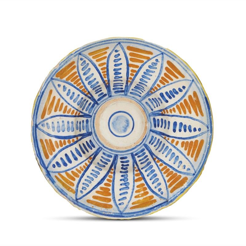 in maiolica dipinta in policromia con giallo, giallo arancio, verde ramina, bruno di manganese, blu cobalto; diam. cm 19,5, diam. piede cm 5,5, alt. cm 3,4