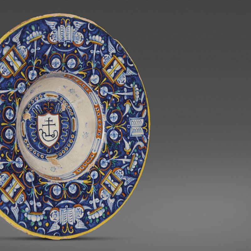 Il piatto costituisce un tipico esempio della tipologia decorativa che interessò la produzione faentina tra il 1520 e il 1530 e che trova capisaldi cronologici in esemplari datati e iscritti, come il piatto del British Museum, in cui si legge la scritta “IN FAENCA”, ma anche nei reperti dagli sterri della città romagnola conservati nel Museo Internazionale della Ceramica.
