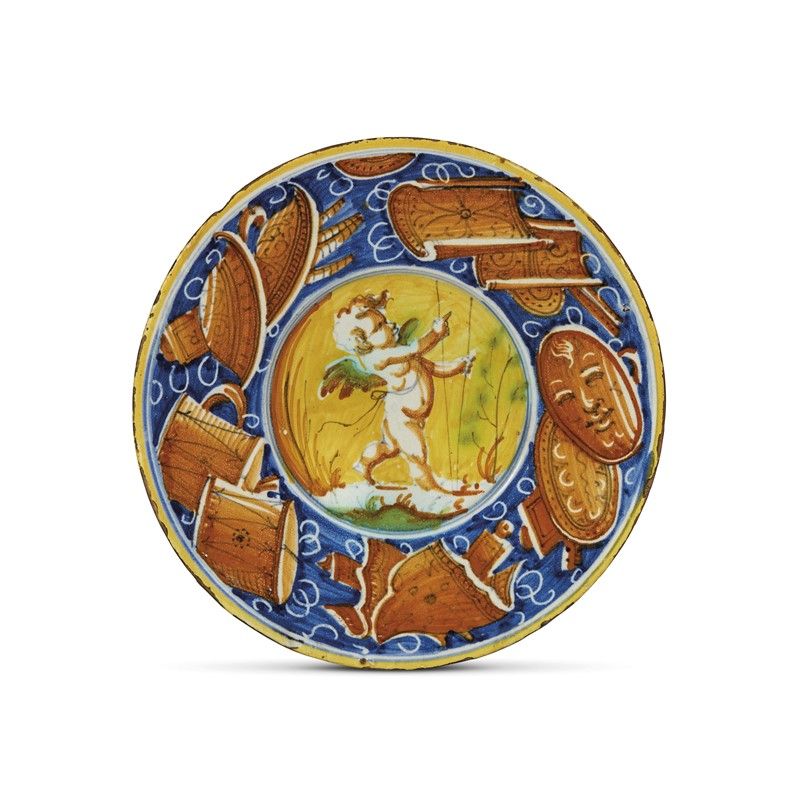 Il piatto ha cavetto piano e larga tesa inclinata con orlo arrotondato poggiante su piede a disco appena rilevato. L’ornato del cavetto mostra al centro, su un paesaggio erboso ombreggiato in arancio, un putto che cammina sorreggendo nelle mani due sottili bastoncini, guarda in alto in un paesaggio brullo tra due alberelli. La tesa, separata da una sottile fascia a cordonatura, mostra un decoro a trofei con scudo animato, e in due cartigli parzialmente coperti si legge una R e quella che sembra una data 15… , ombreggiati a tinte aranciate e lumeggiate a riserva grazie al contrasto con parti risparmiate sul fondo bianco, con nastri graffiti su fondo blu, mentre l’orlo è sottolineato da una linea gialla. Il retro invece non presenta decori, ed è ricoperto da uno strato di smalto con tracce di verdastre.