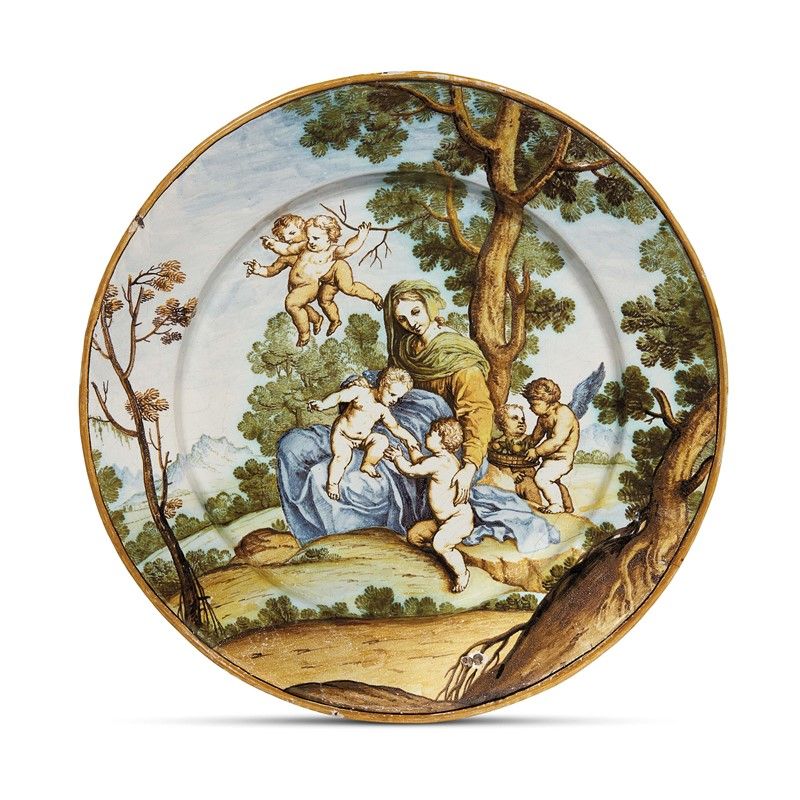 Il grande piatto ha cavetto piano, tesa orizzontale e bordo arrotondato, in maiolica decorata a policromia. La decorazione, che interessa l’intera superficie del piatto, rappresenta la Madonna con il Bambino, San Giovannino e cinque putti in un paesaggio alberato. L’opera, già pubblicata nel catalogo della mostra tenutasi a San Quirico d’Orcia nel 1996 come opera della manifattura Chigi tra Siena e San Quirico con una paternità incerta tra i due principali artefici presenti nella fabbrica attorno al 1730, Ferdinando Maria Campani e Bartolomeo Terchi. Il piatto è entrato così a far parte del repertorio delle opere della manifattura, già ampiamente studiate da Elena Pellizzoni nel suo volume monografico sulla maiolica dei Terchi.