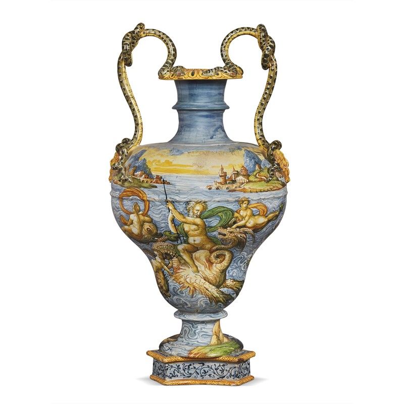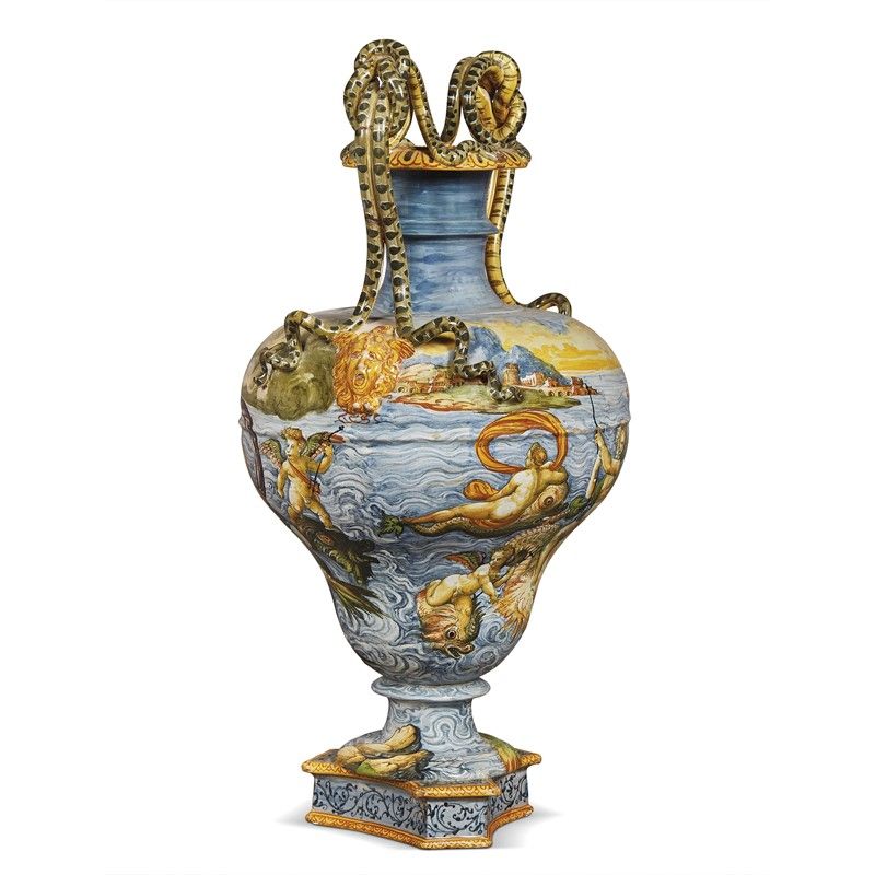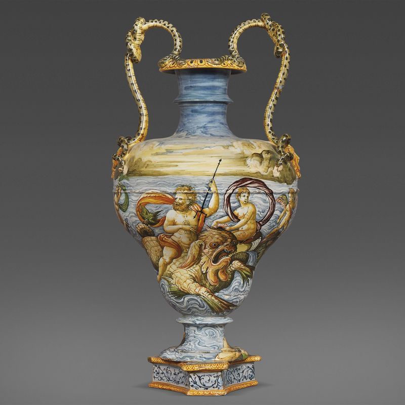 Le figure sono raffigurate secondo uno schema decorativo che trova riscontro in modo particolare in due vasi morfologicamente affini presenti nelle Collezioni Estensi di Modena (inv. nn. 2029-2030), che nel tempo sono stati attribuiti a manifattura urbinate della decadenza prima, e quindi giustamente riportati agli onori della bottega di Orazio Fontana. Il vaso in oggetto si inserisce pertanto nella produzione alta della bottega, che utilizza riferimenti iconografici particolarmente colti soprattutto nella produzione di vasi da parata. Il filo conduttore iconografico, che riporta anche alla grande produzione della bottega per la farmacia di Loreto, è giustificabile con la presenza in bottega di incisioni, non ultima quella del Quos Ego con figura di Nettuno. Questa scelta decorativa si ritrova infatti anche in altri esemplari che appartengono alla produzione per le credenze granducali di Guidobaldo II, e quindi dopo il 1565 per le committenze modenesi, a cui per somiglianza morfologica e stilistica riteniamo di poter attribuire questo esemplare. Le naumachie commissionate dai Duchi d’Este ben si associavano a tematiche marine cui questo vaso si ispira.
