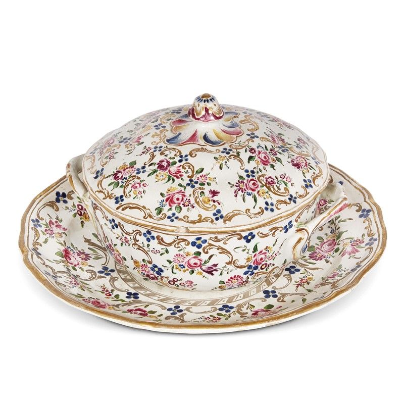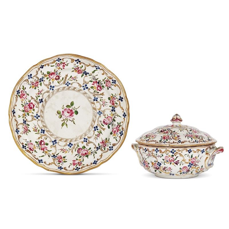 A SMALL SOUP TUREEN OR ECUELLE WITH A SMALL PLATE AND A LID, MANUFACTORY ANTONIO FERRETTI, LODI, 1760-1780