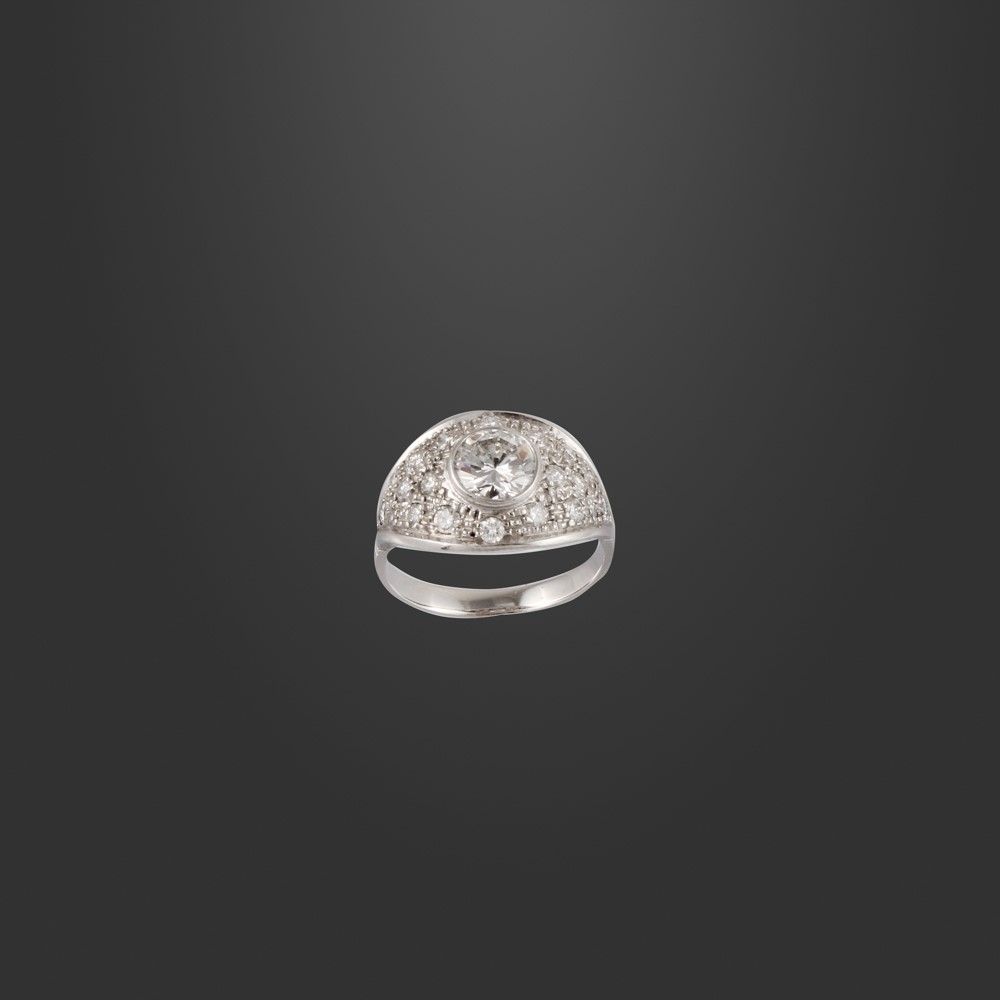 in oro bianco con brillante centrale del peso di 0,70 ct ca., su pavé di brillanti, gr. 5,1.