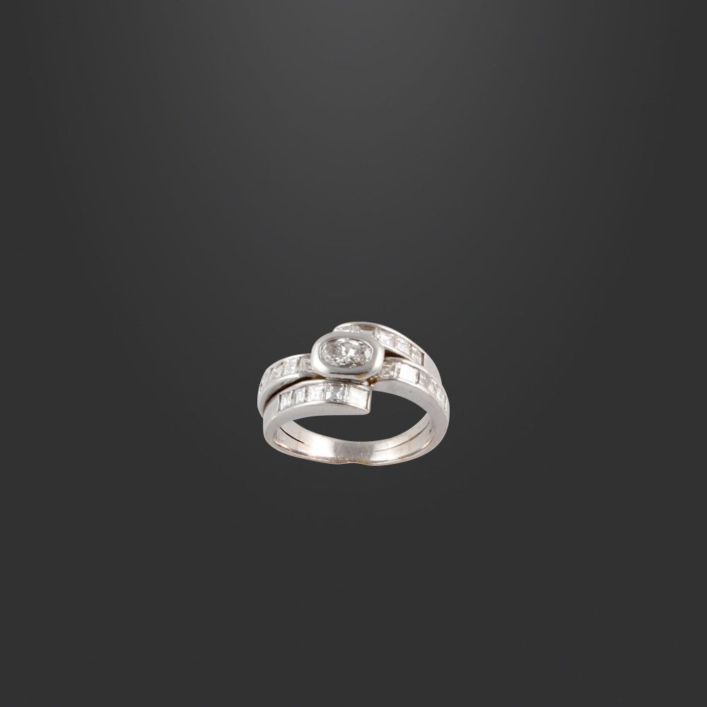 in oro bianco a fascia gradinata con diamanti carré e diamante ovale al centro. Diamanti del peso complessivo di 1,30 ct. ca., gr. 6,5.