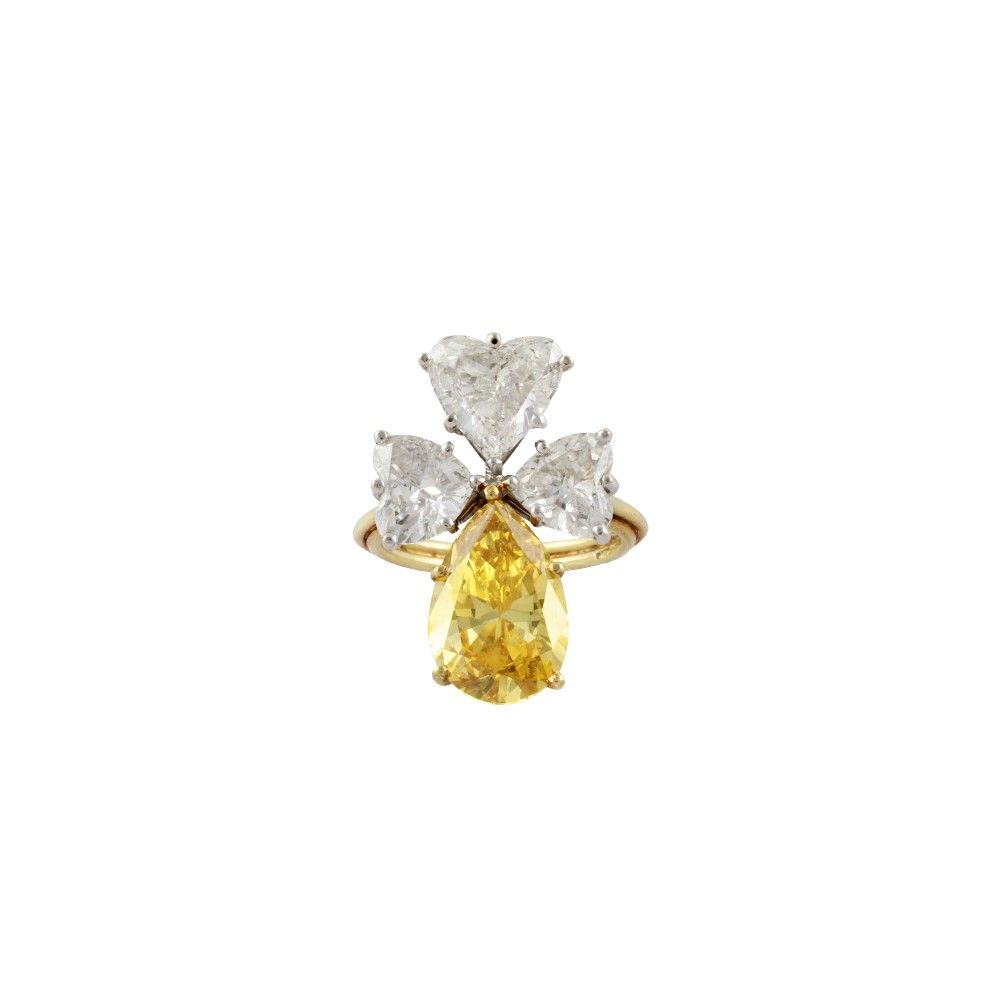 in oro giallo e bianco con tre diamanti a cuore del peso complessivo di 4,20 ct ca. e un diamante giallo a goccia del peso di 4,60 ct ca., gr. 6,9.