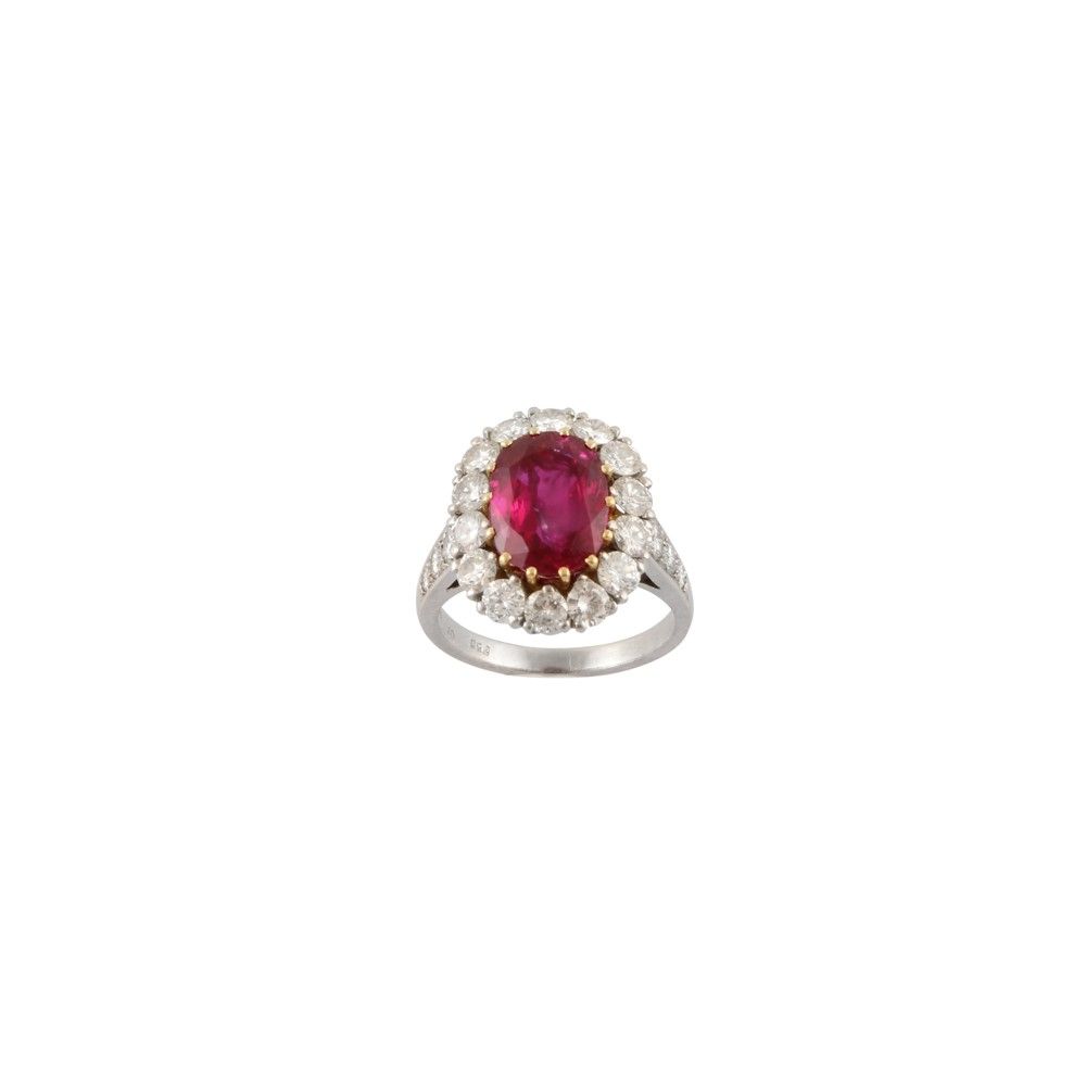 in platino e oro giallo con al centro un rubino Myanmar ovale del peso di 3,50 ct ca., contornato da brillanti riproposti anche su parte del gambo del peso complessivo di 1,60 ct ca., gr. 9,7.