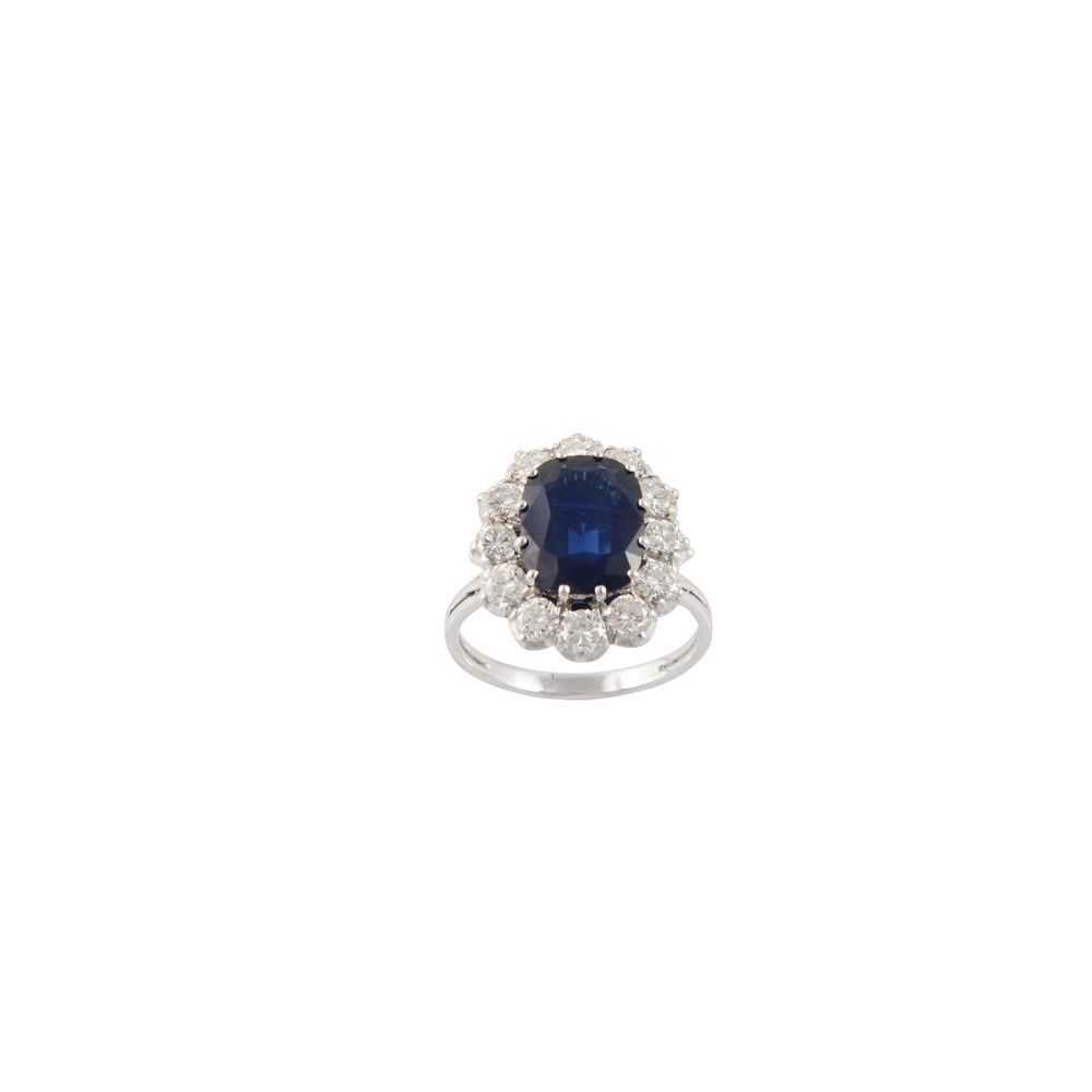 in oro bianco con zaffiro ovale del peso di 4 ct ca., contornato da brillanti del peso complessivo di 2,40 ct ca., gr. 6,8.